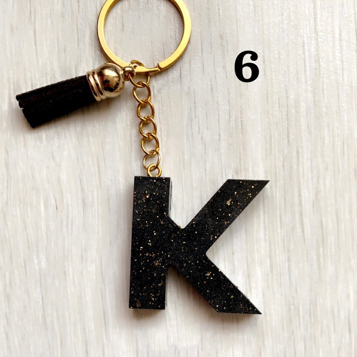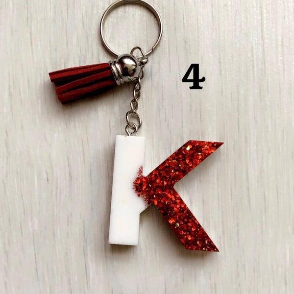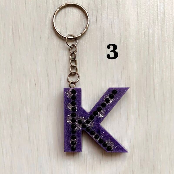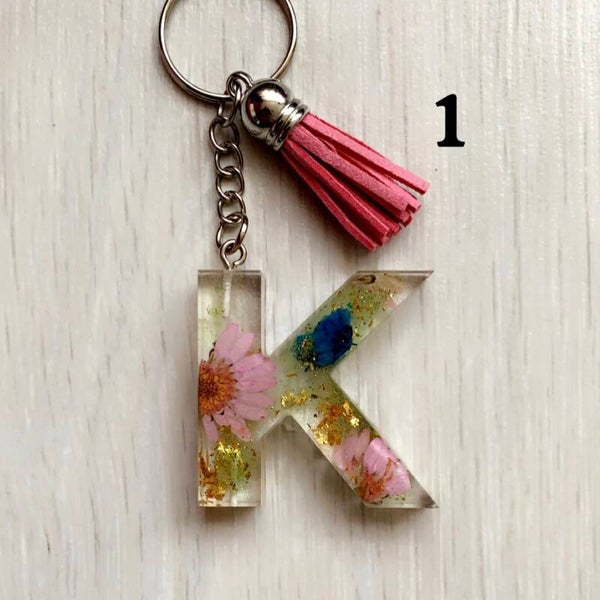 Handgemaakte letter K sleutelhanger van epoxy hars, glitters, gedroogde bloemen, goud vlokjes, enz..