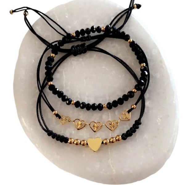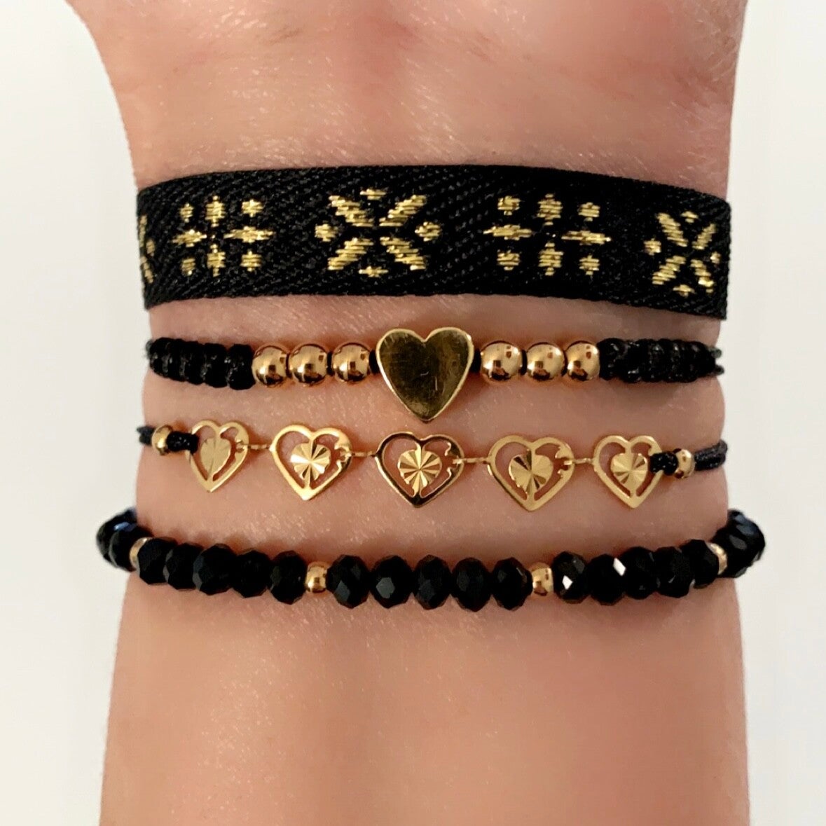 🔸Armband met gouden hart, rvs gouden kraaltjes en zwart koord.