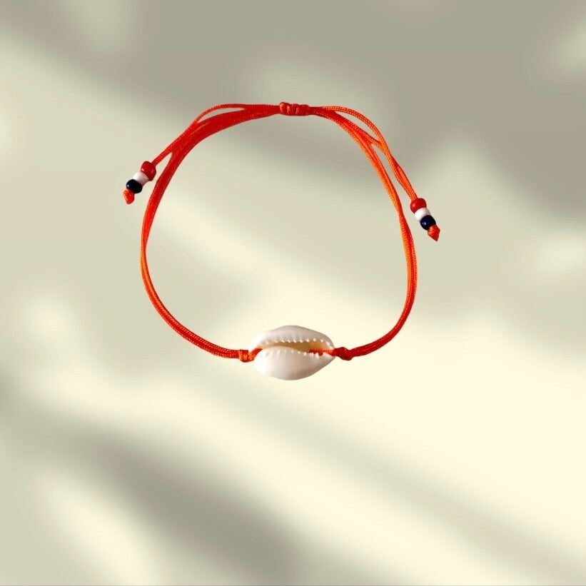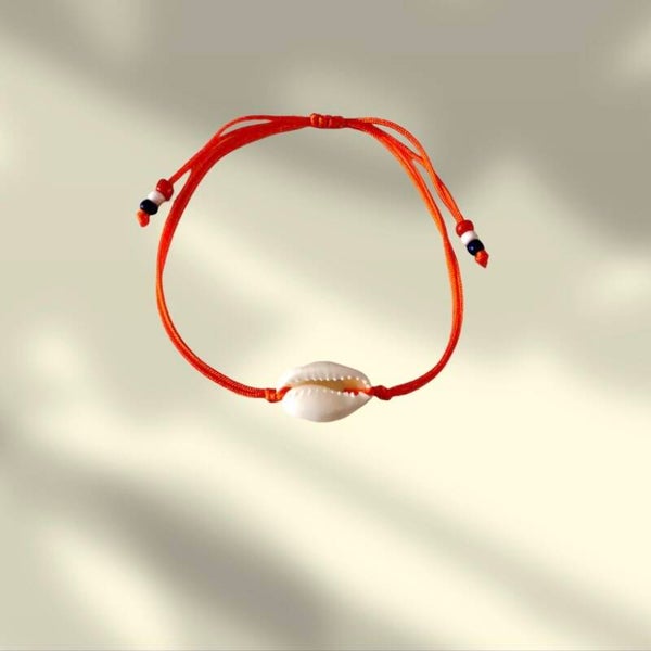 De set bestaat uit oranje schelp armband, satijn armband en lint armband