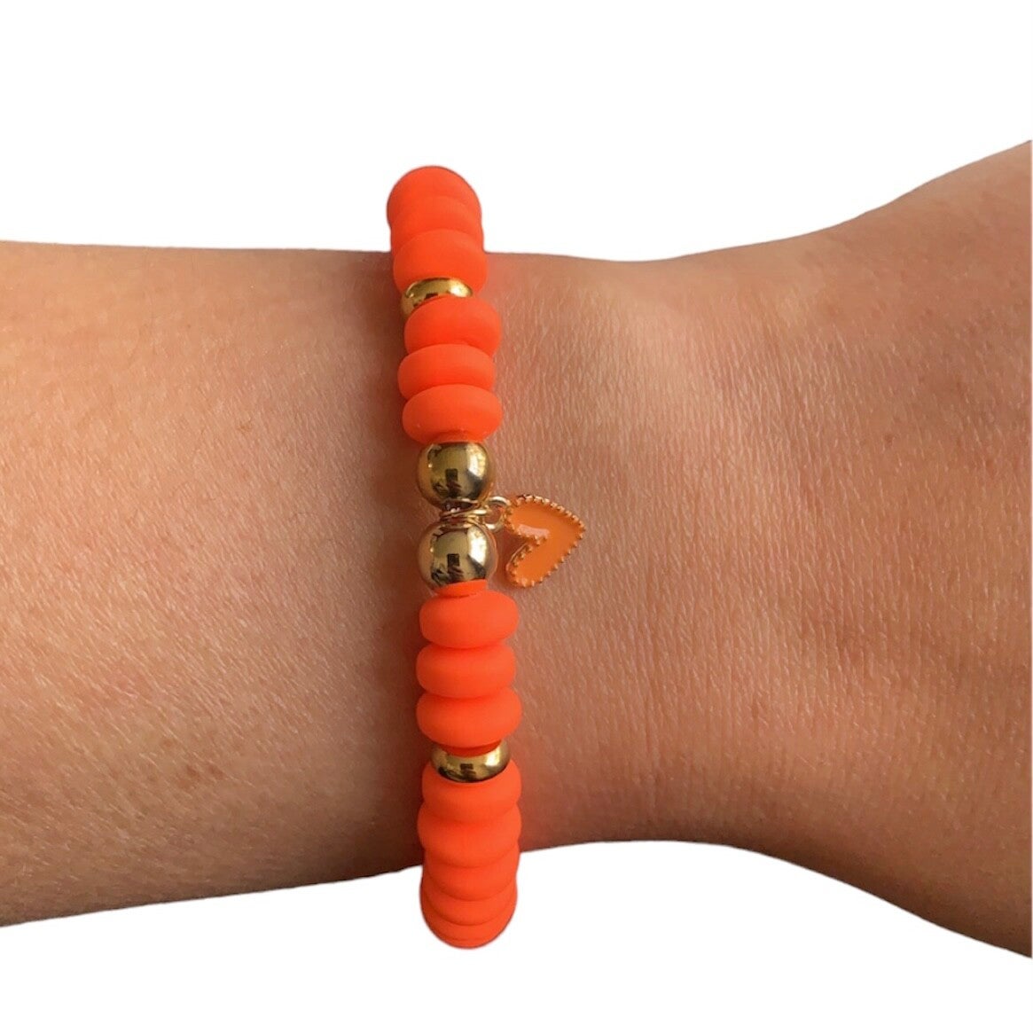 Handgemaakte unieke armband met polymeer rondelen kralen van 7mm, stainless steel goud kralen van 6mm geregen op een sterke elastiek en hartje bedel.