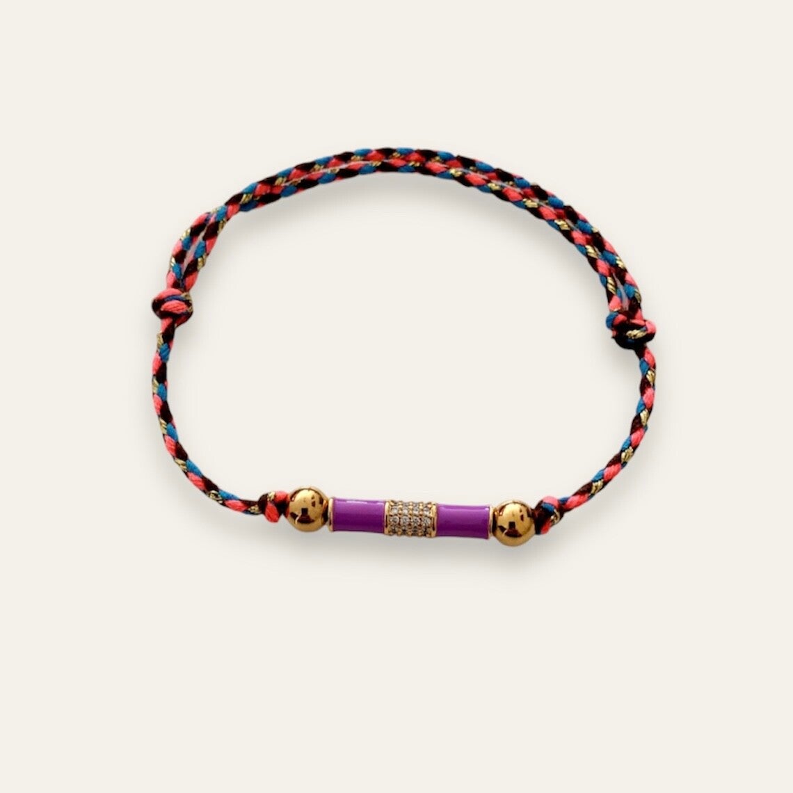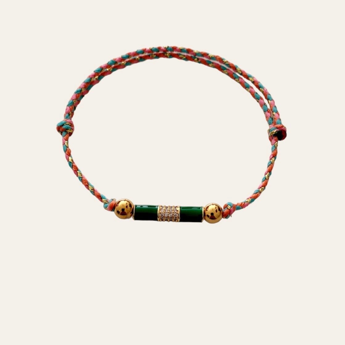 De armband is gemaakt van gevlochten katoenen koord, roestvrijstalen goud kralen en zirconia tube kraal.