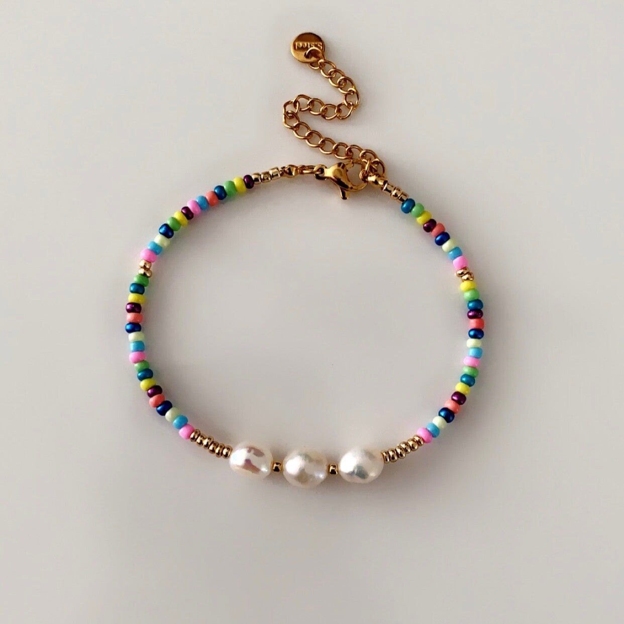 Hoe leuk is deze armband met kleurrijke kraaltjes en zoetwater parels!