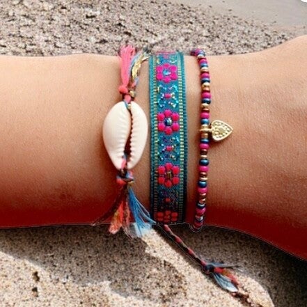 De set bestaat uit 3 armbandjes; hippe schelp armband, bloemen lint armband en kralen armband met hartje.