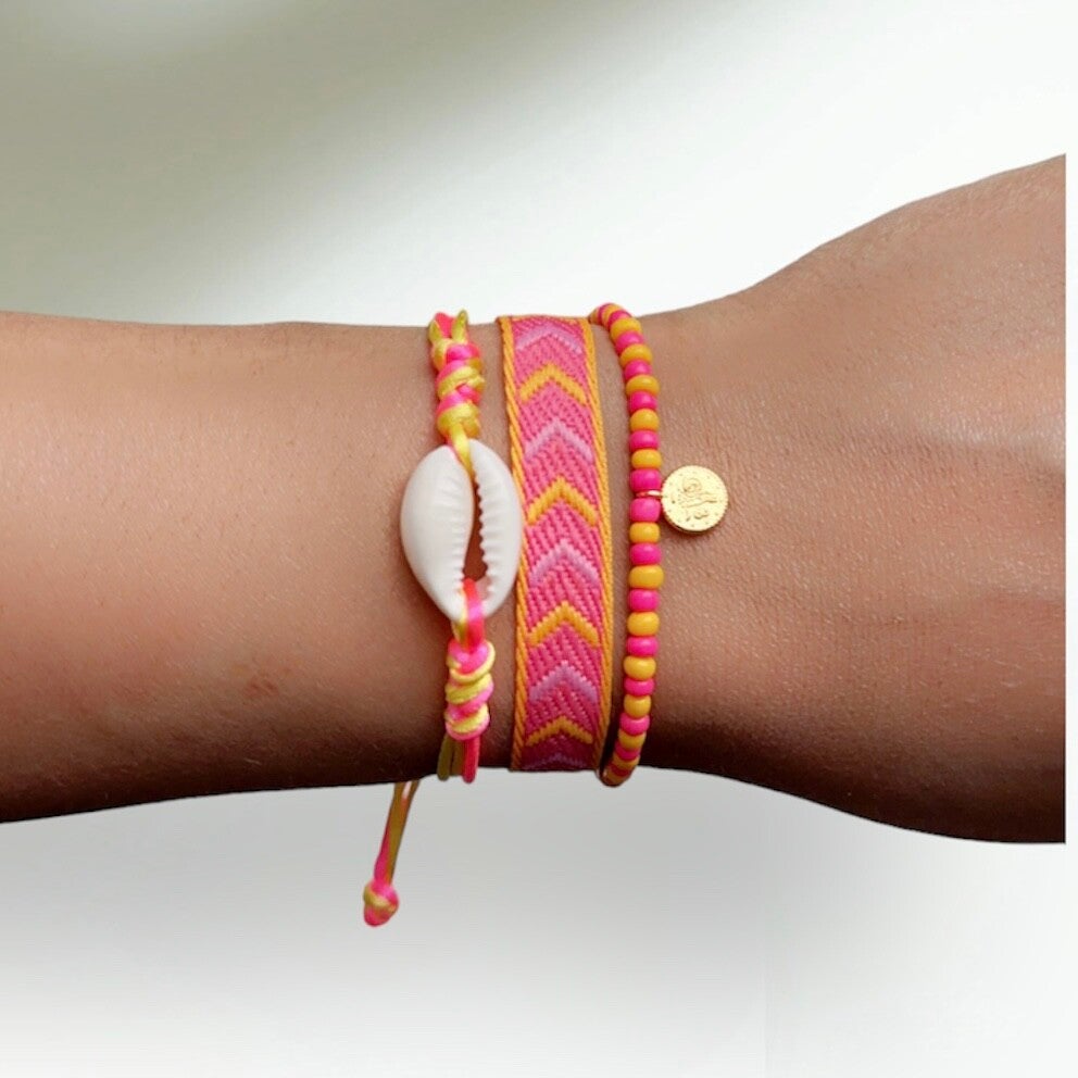 De set bestaat uit 3 armbandjes; hippe schelp armband, pijltjes lint armband en kralen armband met muntje.