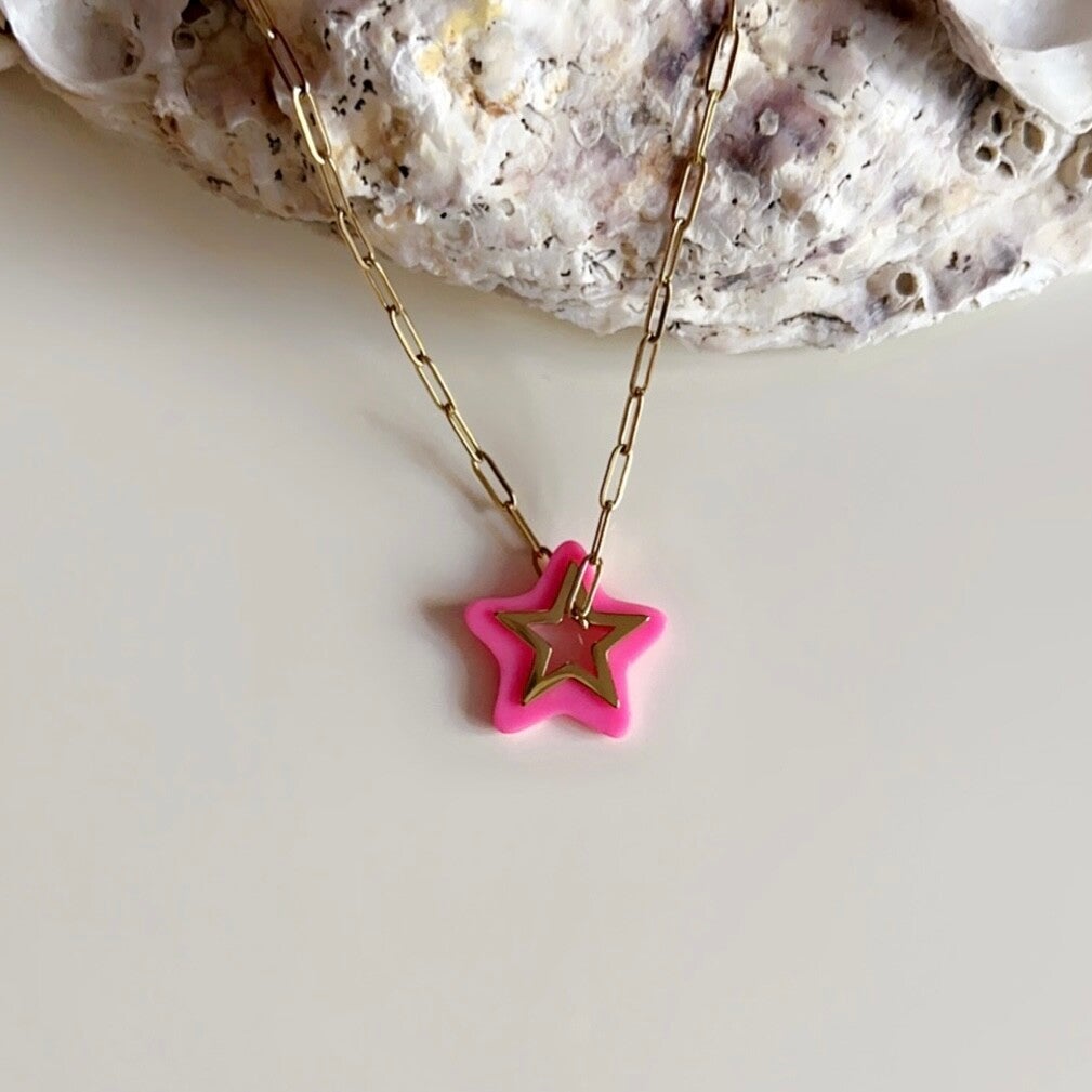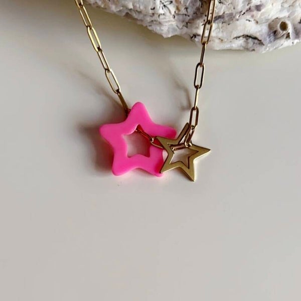 Roestvrijstalen schakel ketting met dubbele ster bedel.