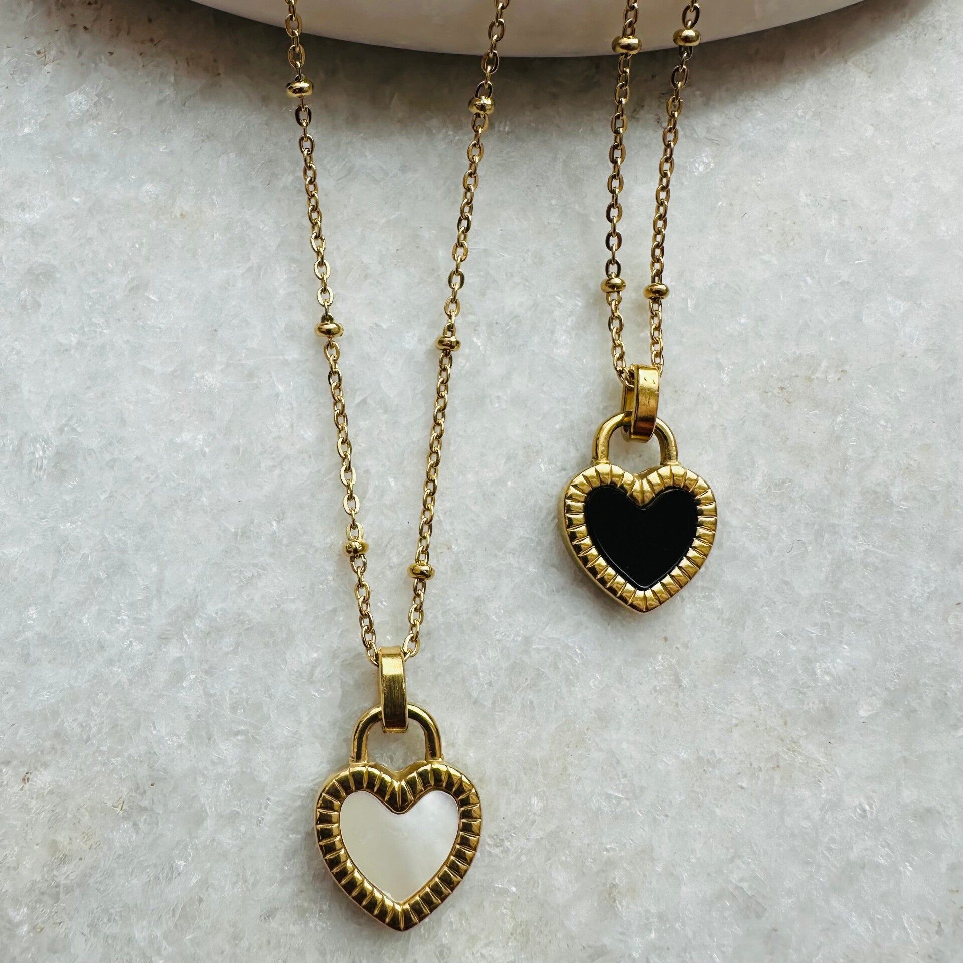 De ene zijde heeft een wit hart en als je de ketting omdraait is de andere zijde is zwart.