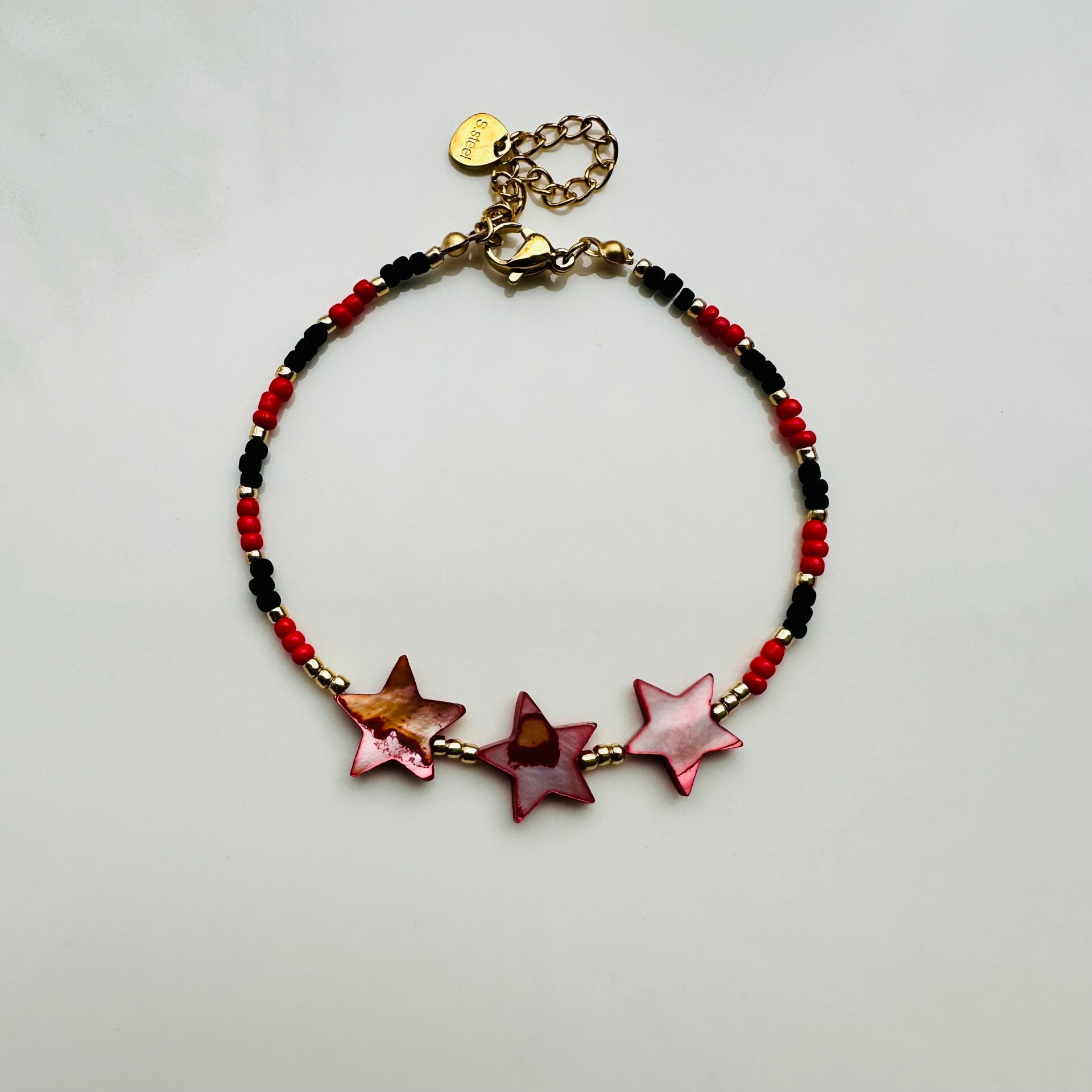 Handgemaakte armband met rocailles kralen, schelp sterren kralen en rvs sluiting.