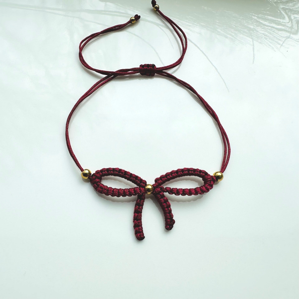 Handgemaakte geweven strik armband met macramé en rvs gouden kralen.