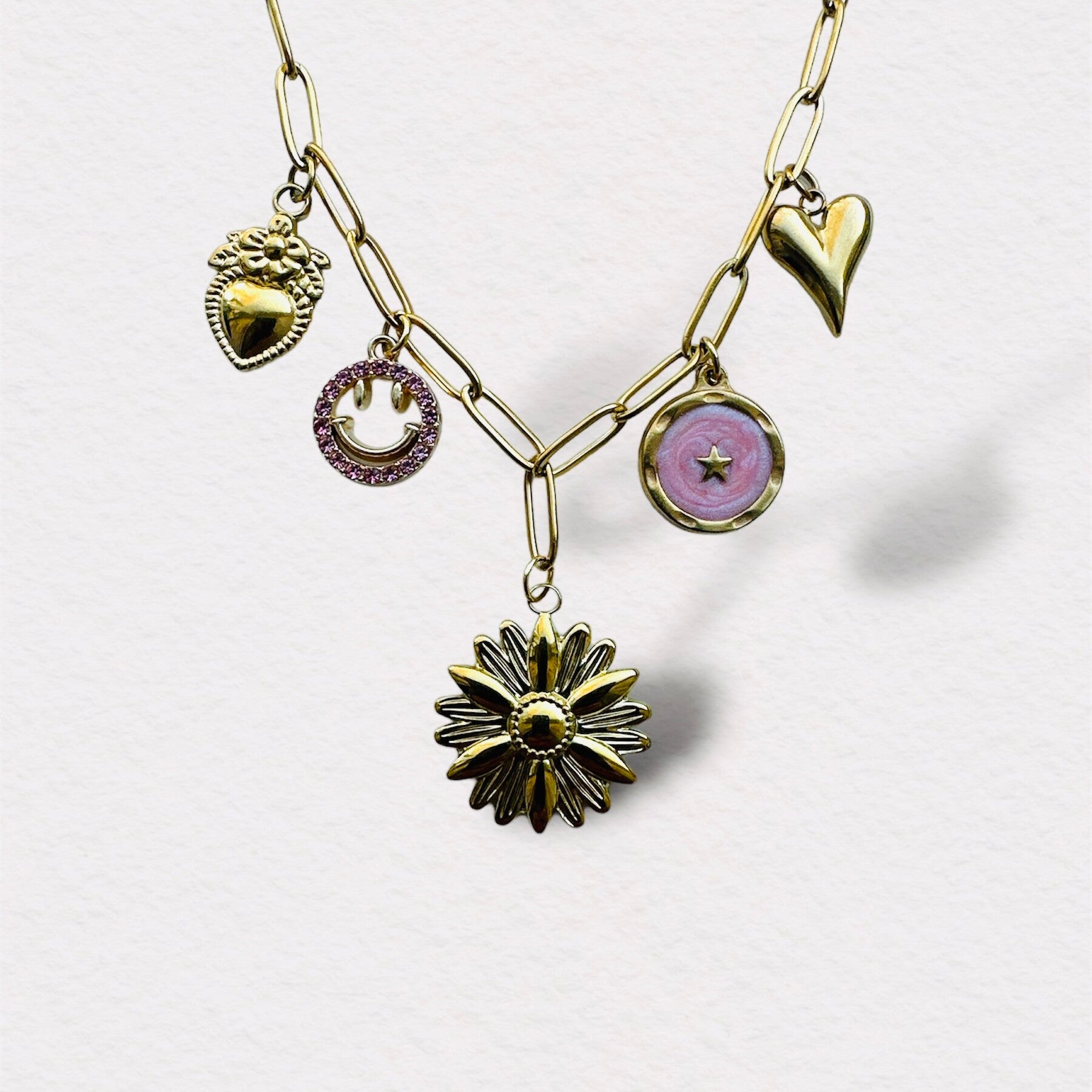 Handgemaakte ketting met 5 verschillende bedels.
