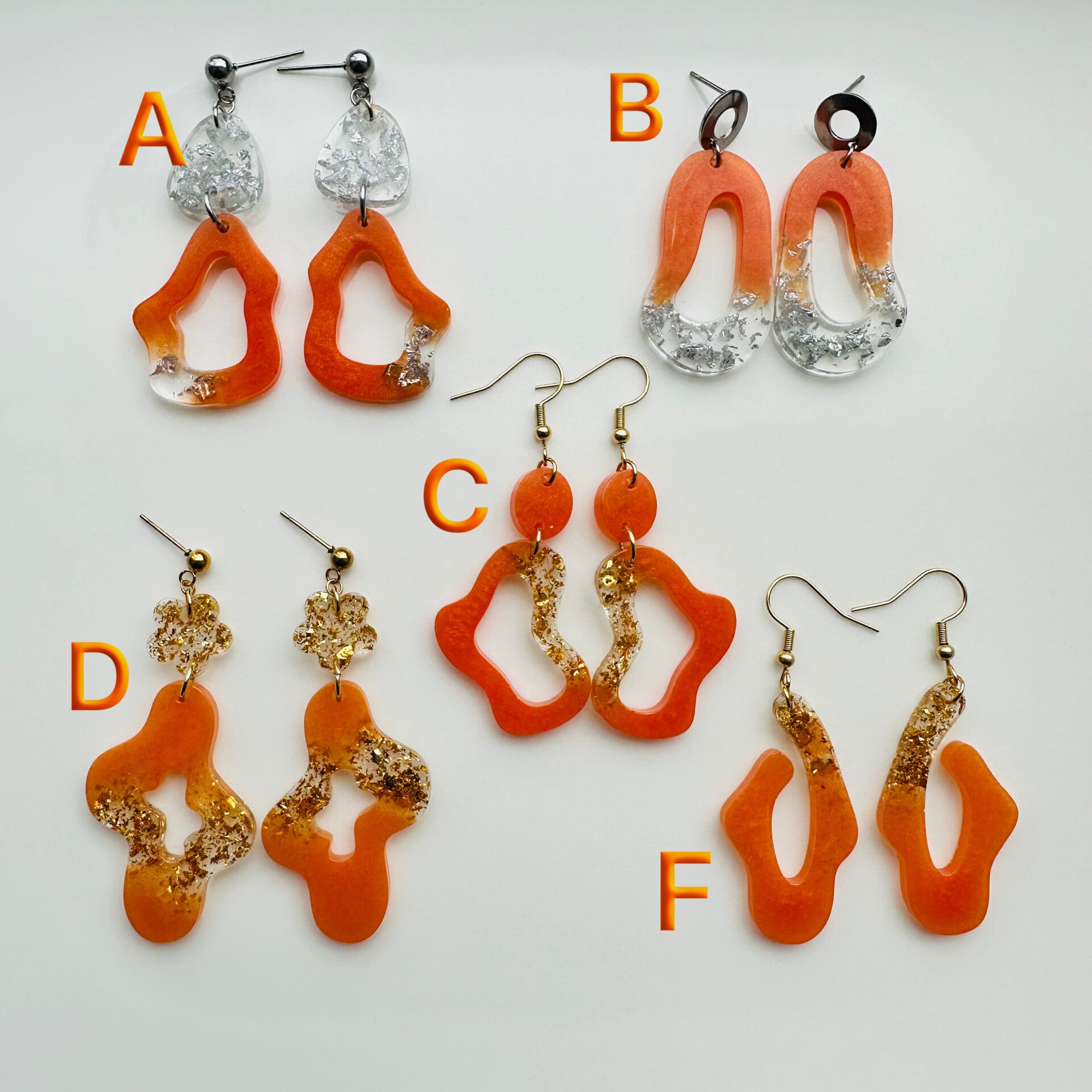 Handgemaakte oranje oorbellen met epoxy en roestvrijstalen studs/oorhaakjes, allergie vrij dus!