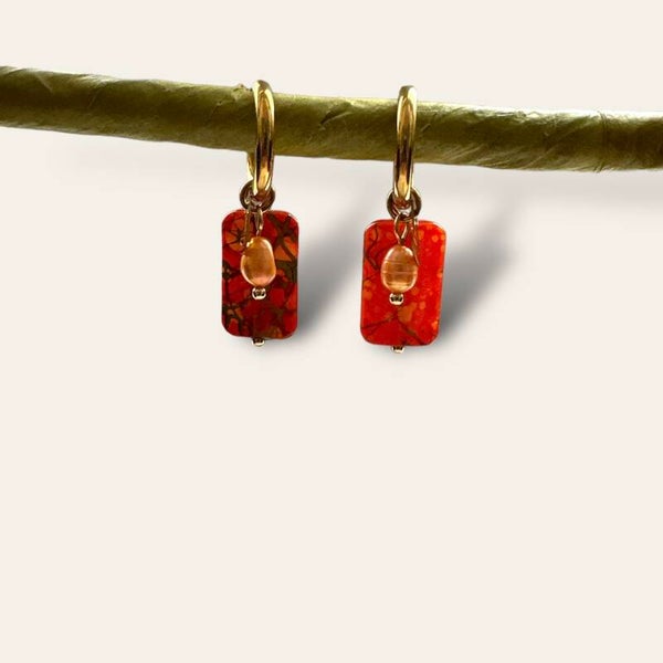 Handgemaakte oorbellen met rechthoekige oranje kralen, zoetwater parels en mini rvs haartjes.