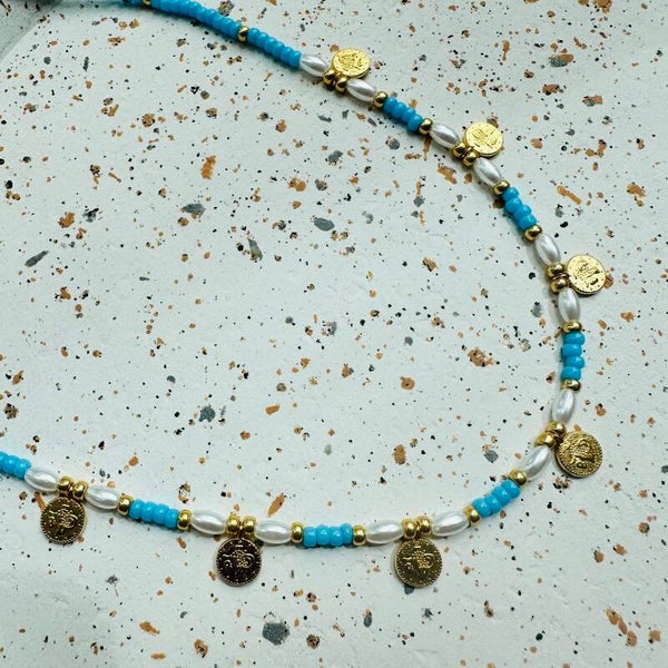 • Deze prachtige ketting is gemaakt van miyuki kralen, imitatie rijst kralen, DQ lucky muntjes en stainless steel sluiting.