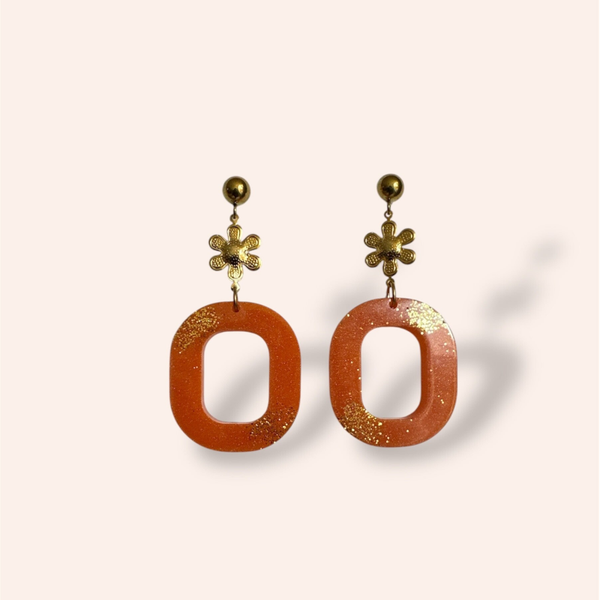 Handgemaakte statement oorbellen met roestvrijstalen oorstekers, bloem hangertjes en resin ovale hangers.
