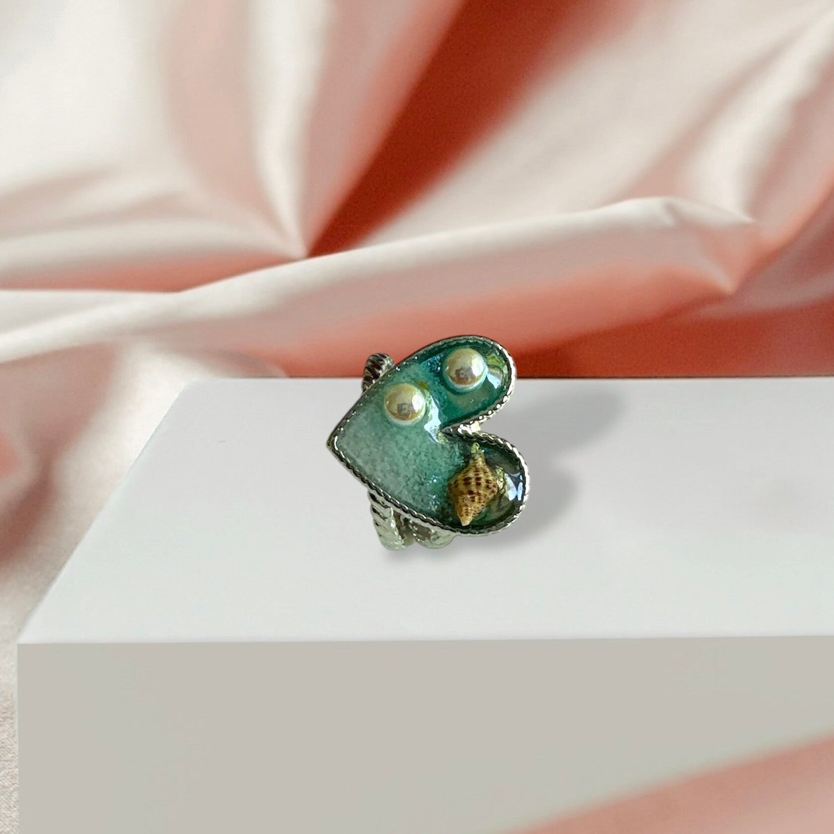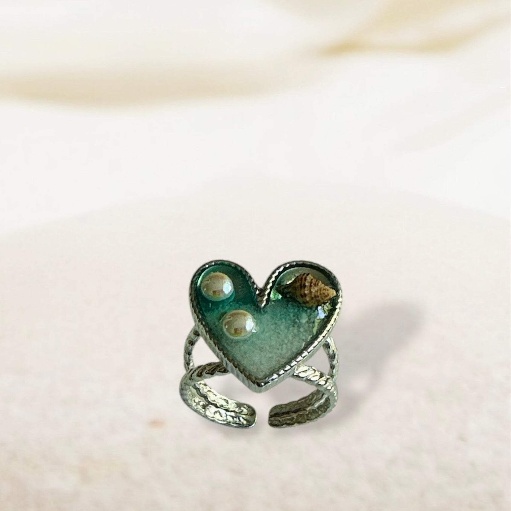 • Deze unieke ring is met de hand gezet met kleine parels, zand, en klein schelpje, vervolgens werden ze afgewerkt met UV hars