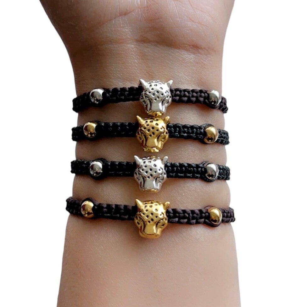 handgemaakte Unieke panterkop armband met waxkoord/satijn koord, roestvrijstalen zilver/goud kleurige kralen en metalen panterkop kraal.