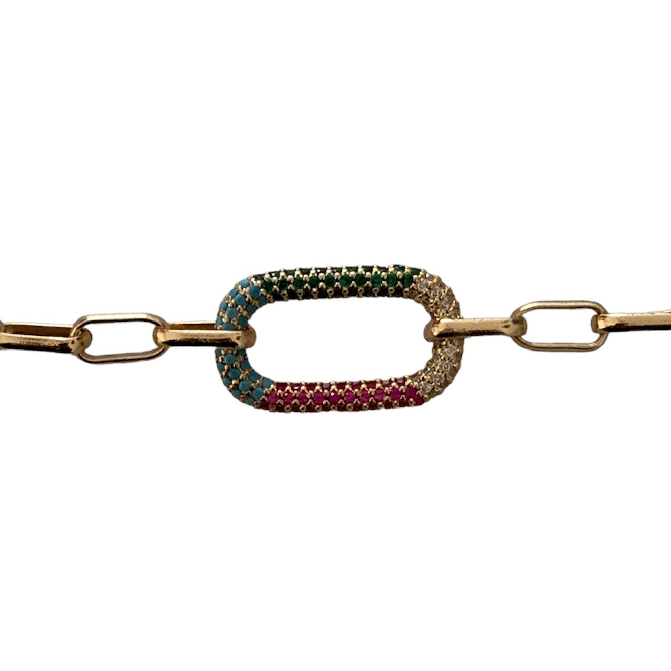 Handgemaakte schakelarmband met kleurrijke zirkonia luxe tussenzetsel en titanium ketting.
