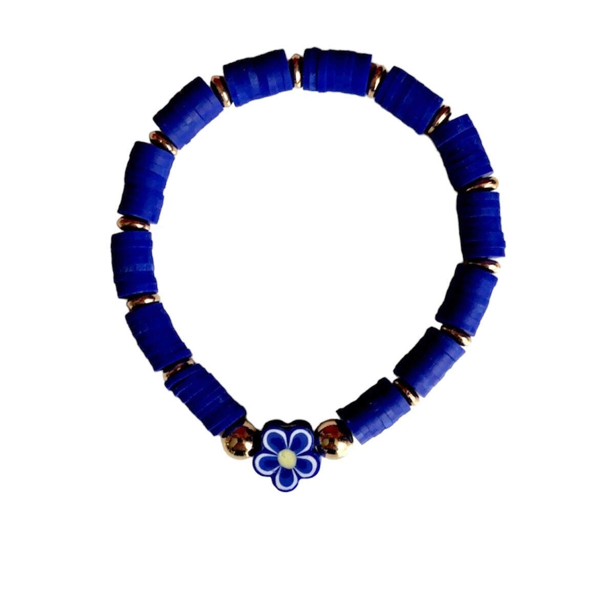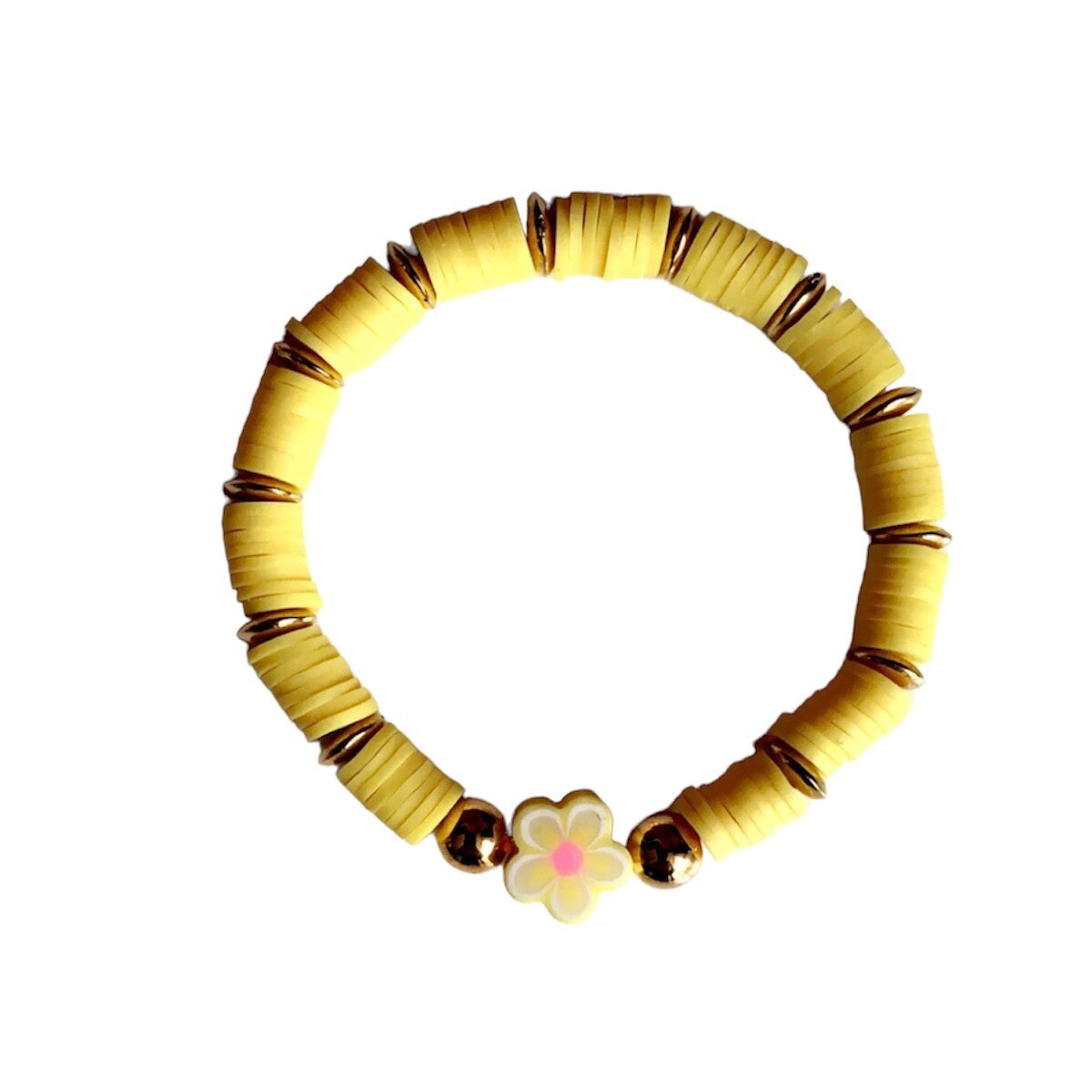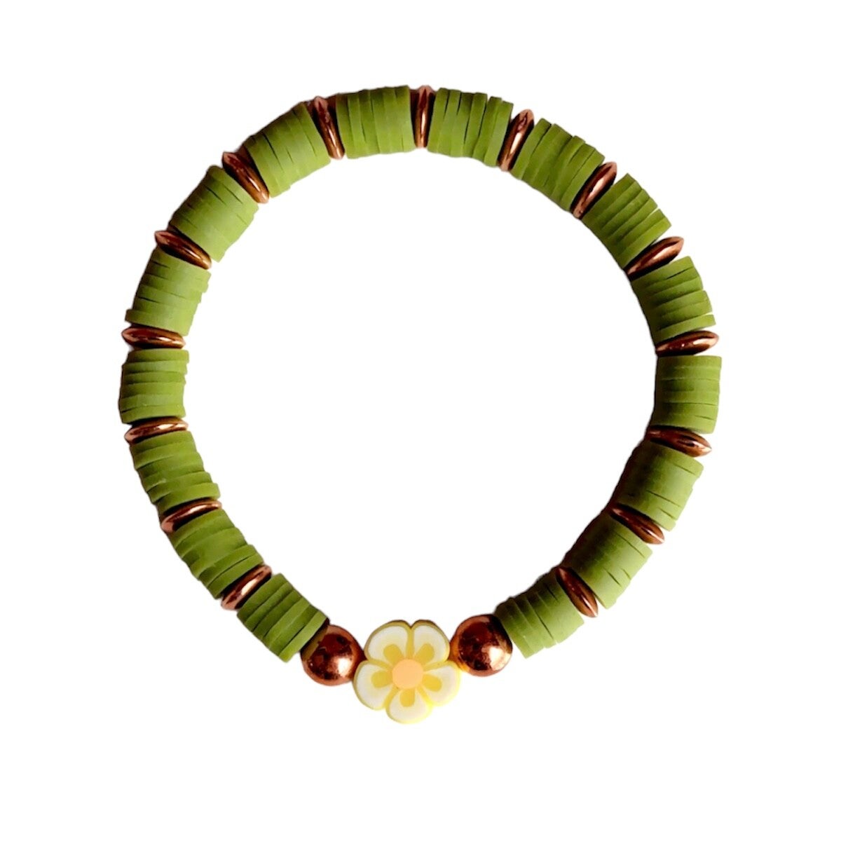Handgemaakte Bohemian armband met katsuki kralen van 6mm, goud metalen kralen van 6mm, goud rondelen kralen van 4mm en polymeer bloem.