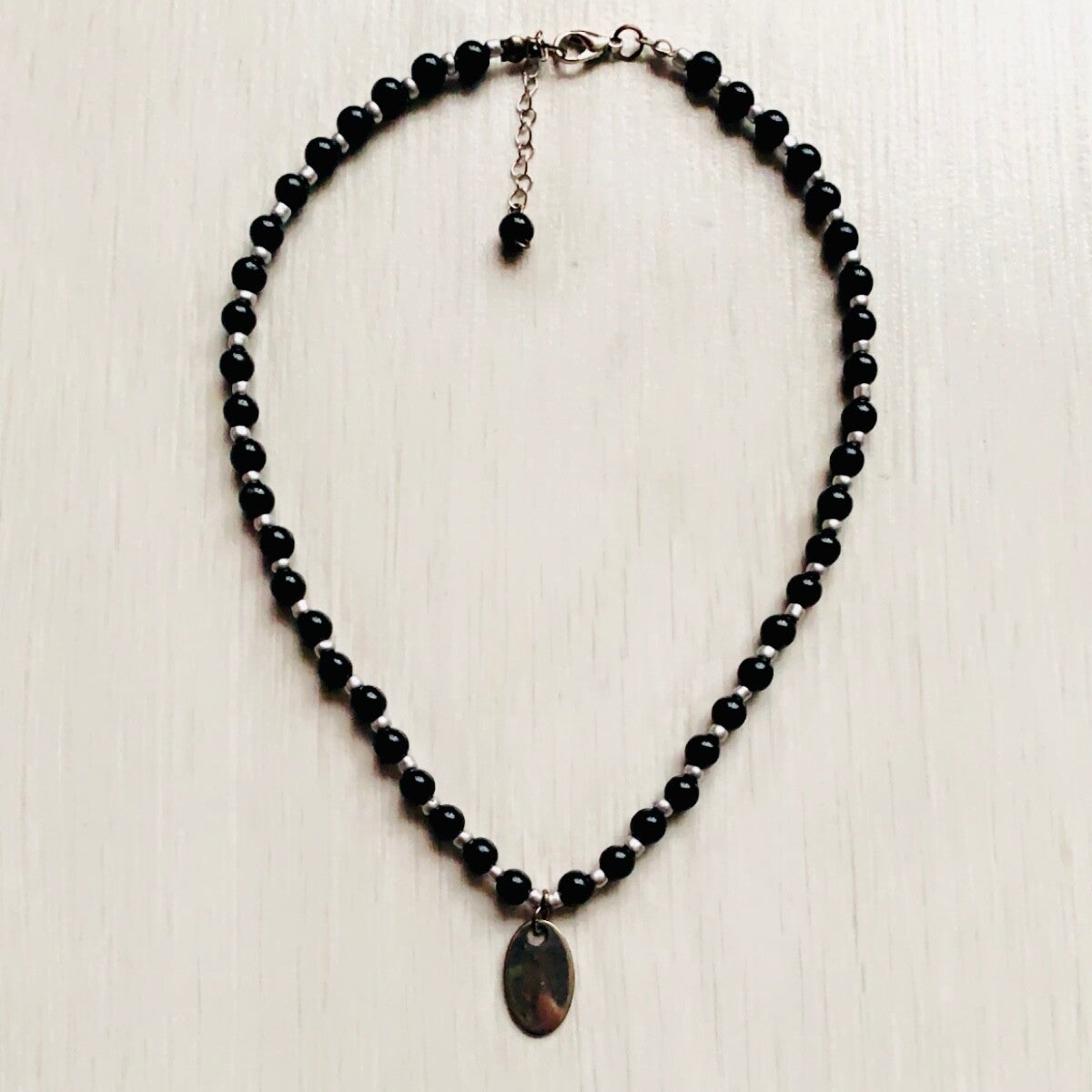 Handgemaakte heren kralen ketting met zwarte parels, zilver rocailles kraaltjes, stainless steel ovaal bedel en stainless steel karabijn sluiting.