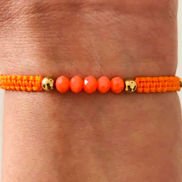 De armband is gemaakt van macramé koord en facet kralen gecombineerd met stainless steel goud kralen